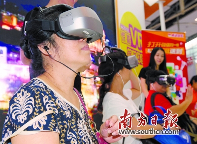 观众戴着VR眼镜,感受着足不出户的虚拟旅游魅力。南方日报记者 吴伟洪 摄