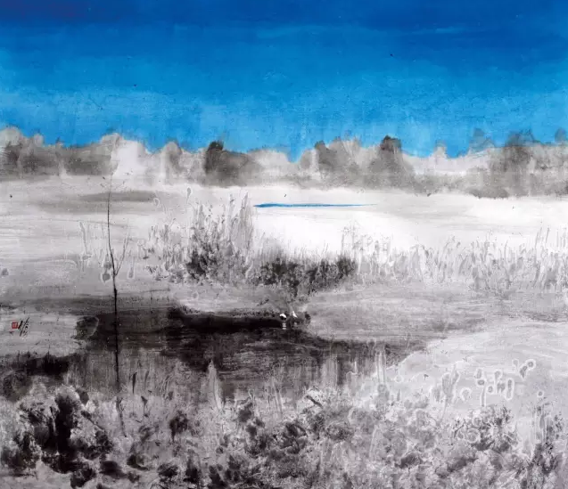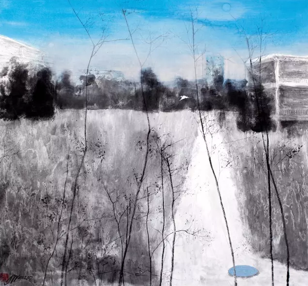 复杂的事情简单化,简单的事情复杂化是绘画艺术中的辨证法。米氏的草平面中复杂无比,细看则无一草;米氏的天空清澈透明,细看则丰富无常;米氏之水天上来、落地一镜映人间。这些水墨的境界是传统水墨中不可想像的,当新的笔墨手段已经承裁起了中国传统水墨中的文人化情怀,其画中的水韵墨趣诗情画意已经跃然纸上。题诗写跋就显得很无趣了!故米氏作品中大都无题诗写赋之类。