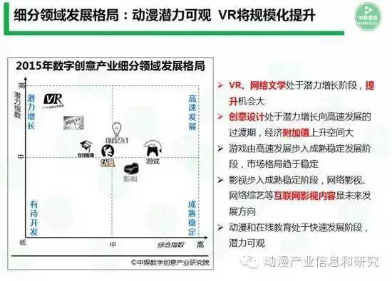七大细分领域综合指数显示:游戏、影视行业发展相对成熟,排名靠前;创意设计处于成长阶段,融合创意内容和智能设计;动漫、在线教育、网络文学紧随其后,稳步发展;VR处于发展早期,综合排名靠后。具体的,游戏产业链稳定;动漫行业要素指数排名第三,高于平均水平;VR潜力最大,以30.1%的增速位于榜首。细分领域发展格局方面,VR、网络文学处于潜力增长阶段,提升机会大;创意设计正在向高速发展过渡,经济附加值空间大;游戏相对成熟稳定;网络影视、网络综艺等互联网影视内容是未来发展方向;动漫和在线教育处于快速发展阶段,潜力可观。