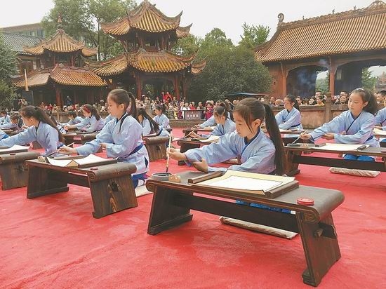 10月15日,德阳文庙广场人头攒动。一场中小学生诗文诵读,拉开德阳首届传统文化周活动大幕。与以往不同,参观人群中除了德阳市民,还有来自全国各地孔庙保护单位和世界儒学大会的200余名专家。