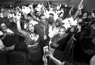 2015年9月11日至20日,第五届中国成都国际非物质文化遗产节举行,在充分展示“一带一路”沿线国家非遗的同时,也探索通过市场化手段,整合市场资源,推动非遗资源的转化利用。图为参加遗产节演出的演员与观众一起欢呼。陈曦 摄