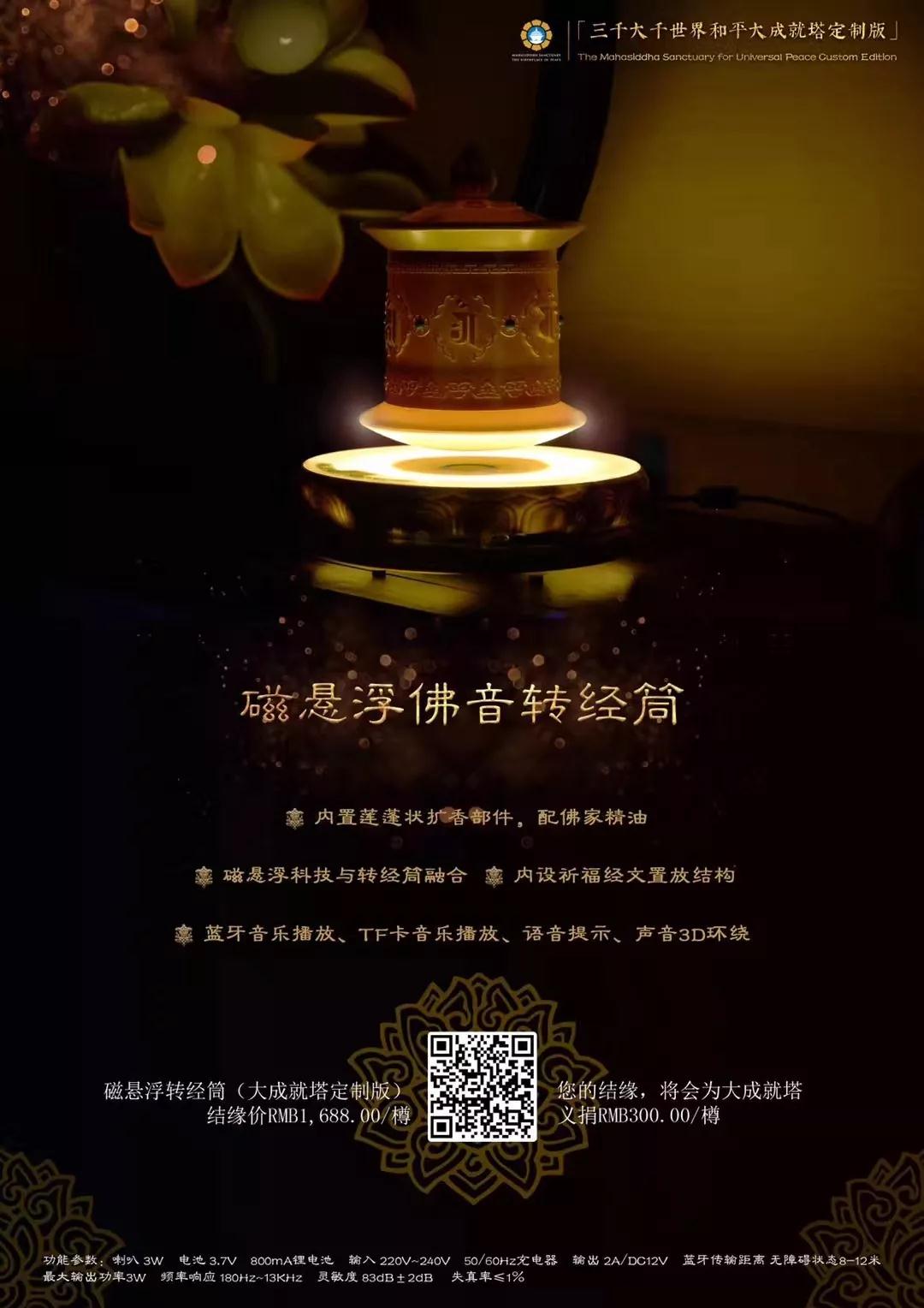 您每购买一尊磁悬浮转经筒,和平成就塔项目基金会将获得300元的爱心基金,我们诚挚地期望能与您同行,祈愿您吉祥如意,幸福安康!