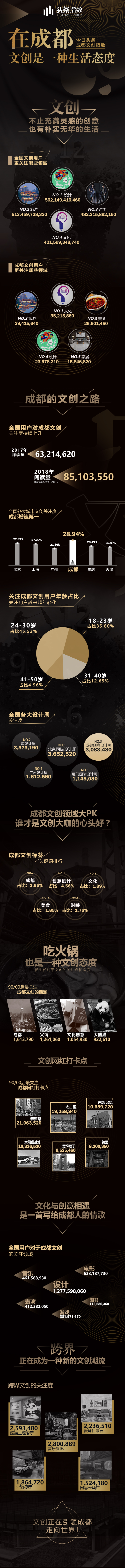 成都文创关注度增速笑傲全国,得益于越来越多的年轻人对文创领域的关注。据头条内部数据显示,关注成都文创的今日头条用户中,18-30岁的用户占比超过了81.3%,创意设计、文化、美食、时装都是年轻人关注的成都文创“关键词”。