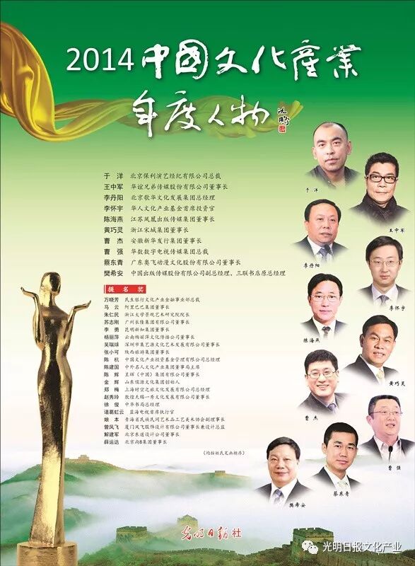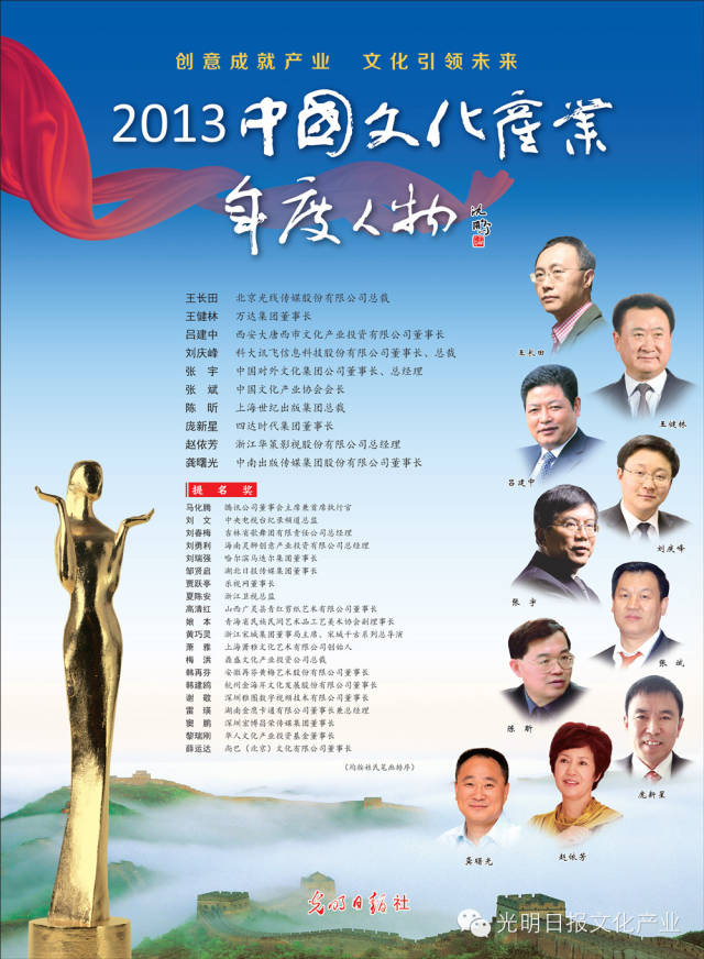 在有关部门的指导和支持下,光明日报社已连续六年成功举办“中国文化产业年度人物”推选活动。过去六年,一批批在文化产业领域各行各业有突出作为的领军人物脱颖而出,受到社会的广泛关注。“中国文化产业年度人物”推选活动发挥了中国文化产业“晴雨表”的作用,呈现了近年来中国文化产业发展的脉络和走向。