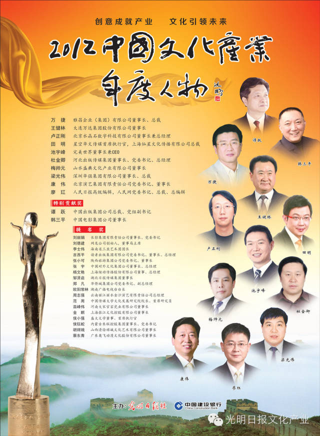 1、标志性——本年度在中国文化体制改革和文化产业发展方面有引领作用的标志性人物,产生广泛的影响和社会关注度;