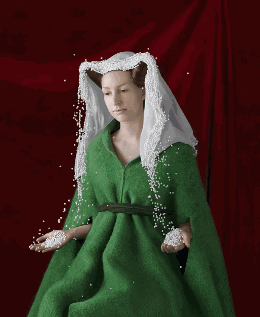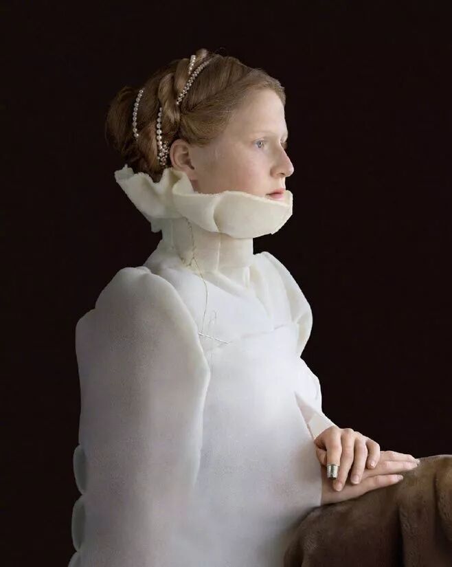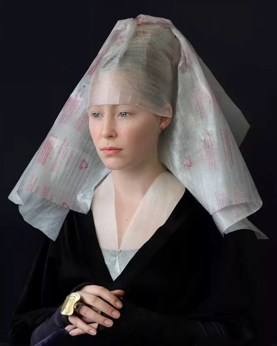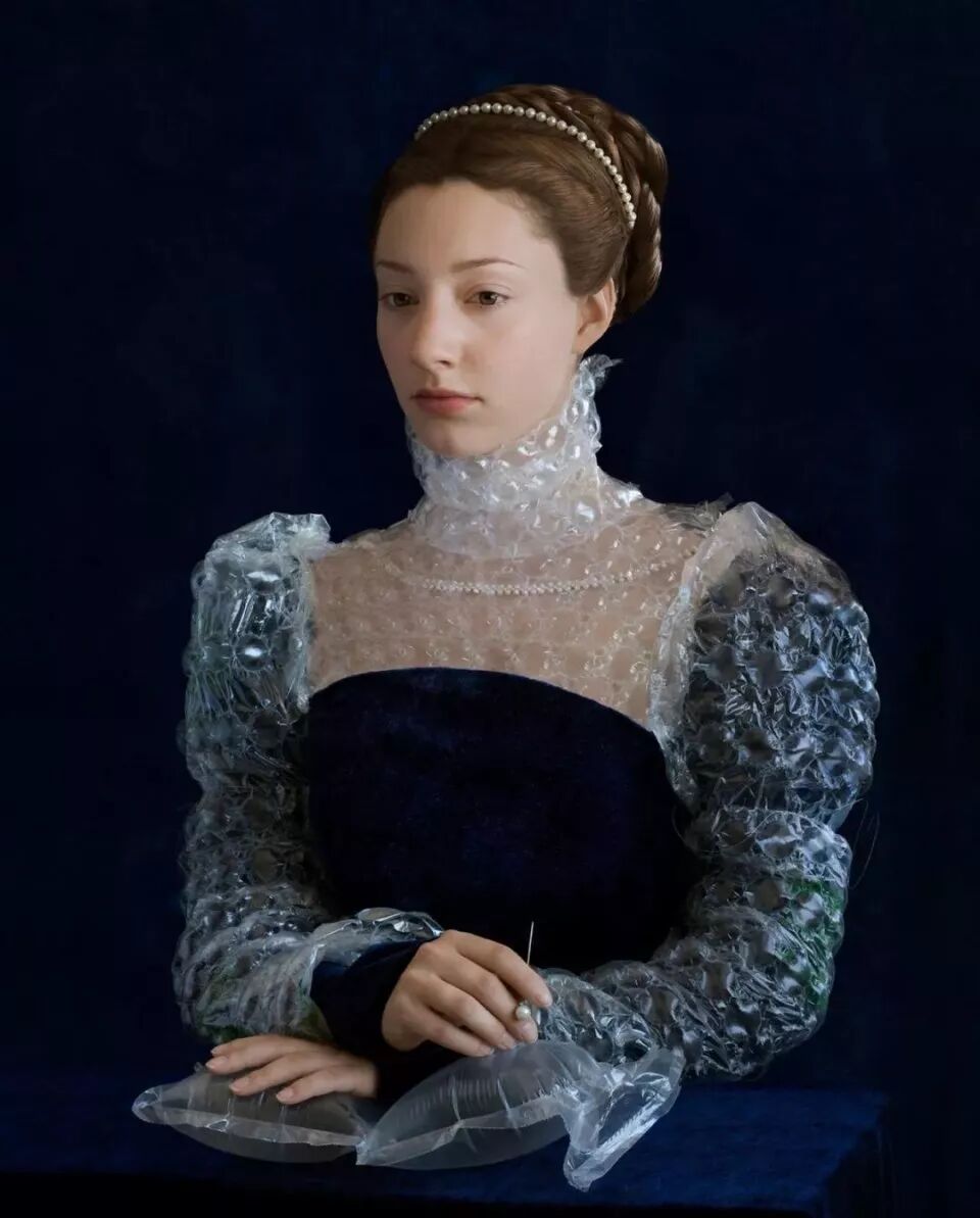 Suzanne在雕塑和服装设计方面另辟蹊径,她用废弃的泡沫塑料、减震泡泡等廉价材料,制作服饰配件,重温15-17世纪经典肖像风采。从中可以找到不少文艺复兴油画大师作品的影子。