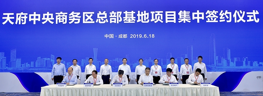 在天府中央商务区总部基地项目集中签约仪式上,招商局集团西部总部及招商蛇口城市综合开发运营、国家电投集团西南总部、东方电气集团创新中心和“一带一路”海外业务中心、中国建材西南总部、新希望全球控股总部及总部经济园区、正大集团医疗健康产业中国总部及高端商业综合体等30个项目集中签约。随后,举行了天府中央商务区总部基地项目启动仪式。省委常委、成都市委书记范锐平和李建红分别致辞。上午11时20分许,彭清华宣布:天府中央商务区总部基地建设启动。